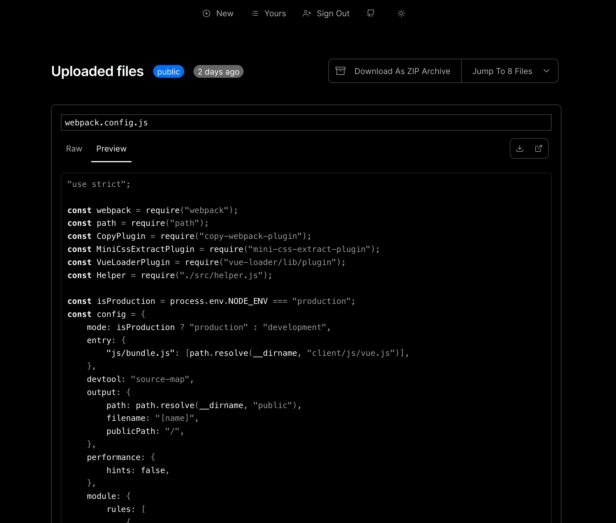 A page showing a post title, the ability to download all files a ZIP archive, a dropdown to jump to specific files, and a file titled 'webpack.config.js' with javascript highlighted code.